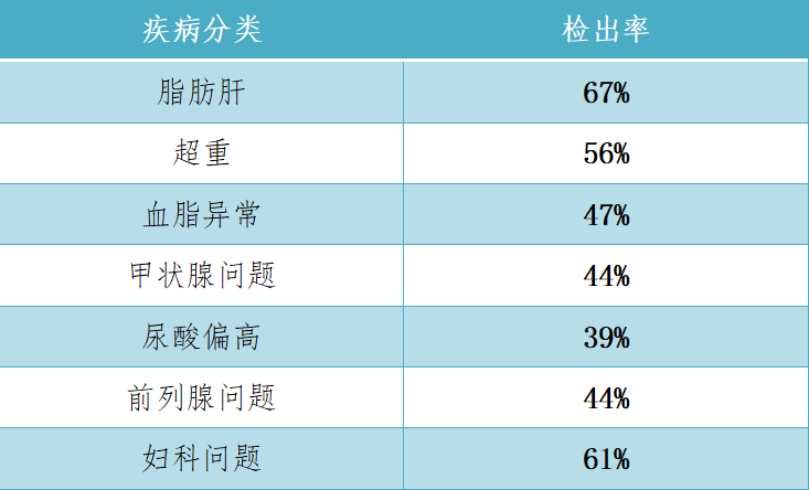 本次體檢統(tǒng)計(jì)顯示,發(fā)病高居榜首的是脂肪肝(約占67%),第二位的是超重(約占56%),第三位的是血脂異常(約占47%),第四位的是甲狀腺問(wèn)題(約占44%),第五位的是尿酸偏高(約占39%)。另外,男員工前列腺問(wèn)題(約占44%),女員工婦科問(wèn)題(約占61%)。